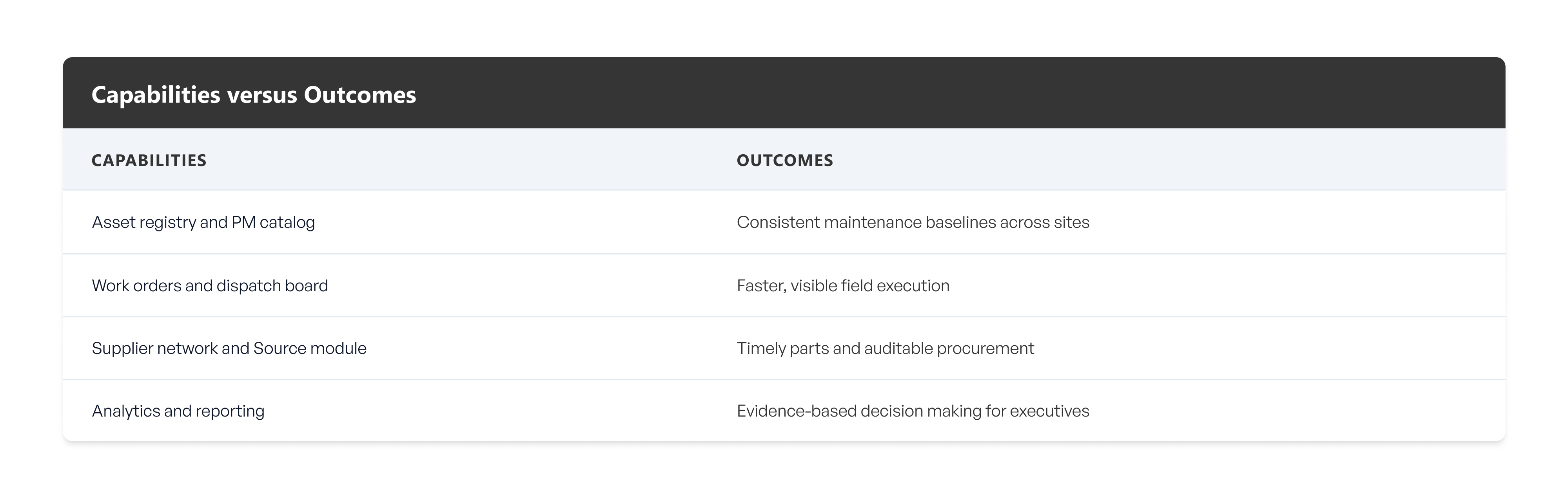The benefits include reduced downtime, better regulatory compliance, consistent service delivery across sites, and clearer cost control through integrated procurement and contractor performance data.
